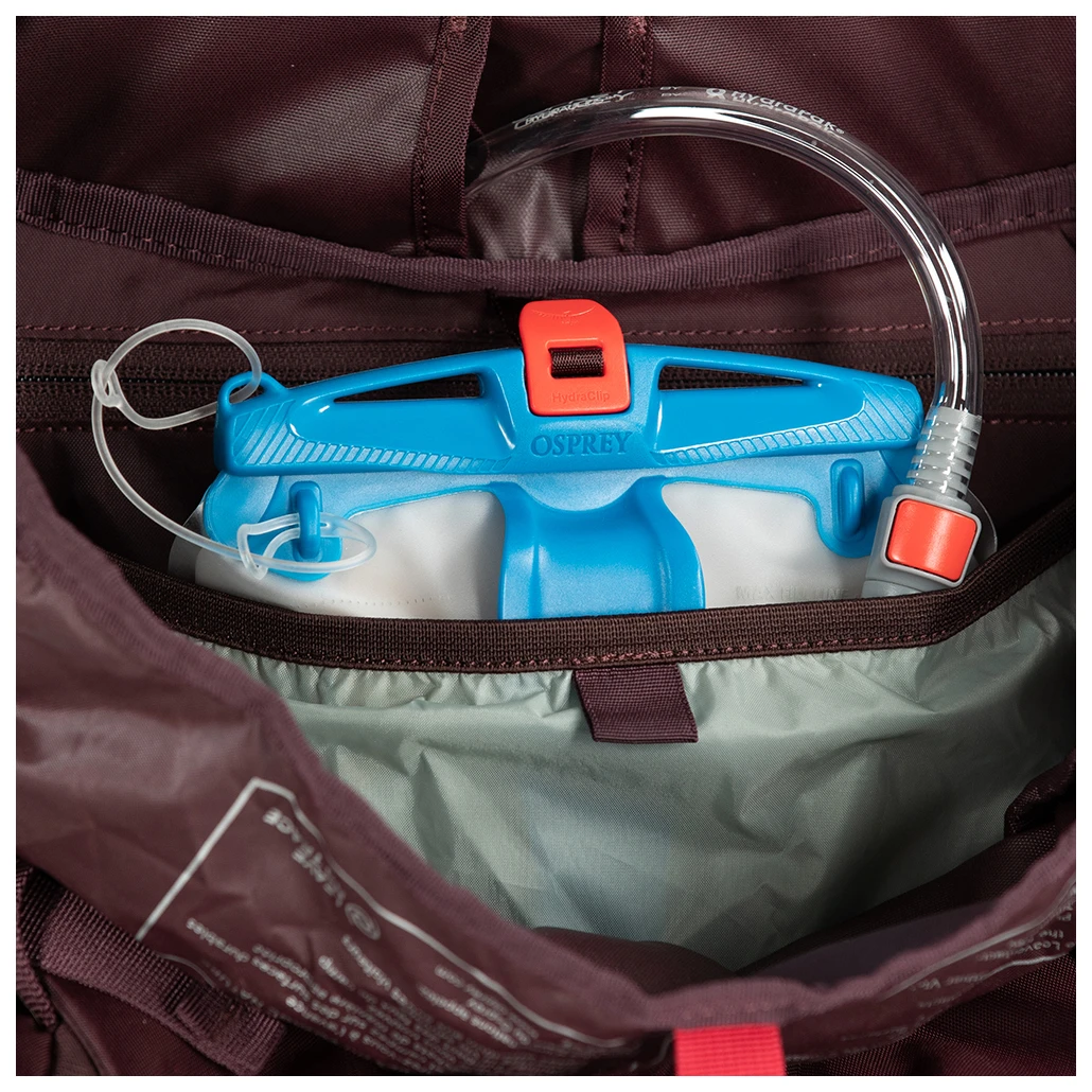 The Women’s Kyte 58 trekking backpack from Osprey offers 58 litres of storage space. It lets you transport between 14 and 20 kg of luggage and equipment on tour. The large backpack has a slim and compact cut, nicely distributing the load, offering freedom of movement and good ventilation.